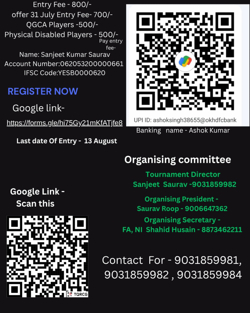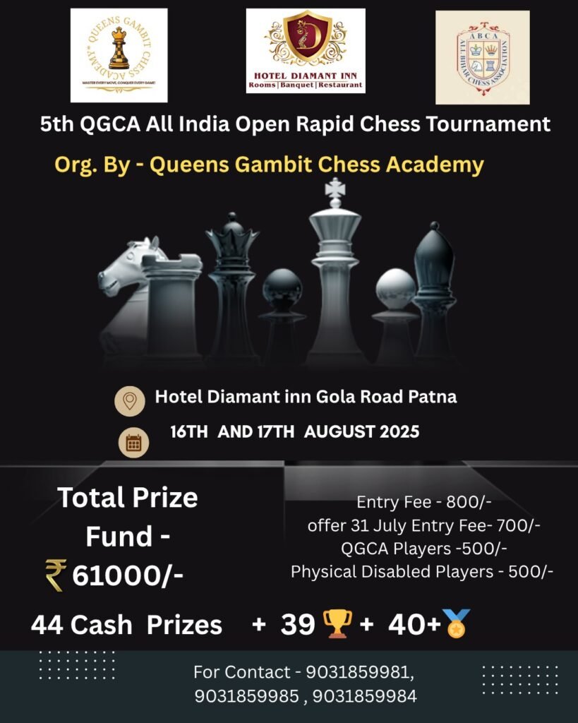 पाँचवी क्यूजीसीए ओपन रैपिड शतरंज प्रतियोगिता क्वींस गैम्बिट शतरंज अकादमी के द्वारा से आगामी 16 और 17 अगस्त 2025 (शनिवार और रविवार ) को होटल डियामन्ट इन रंजन पथ गोला रोड पटना मेें आयोजित किया जा रहा है। इस प्रतियोगिता का कुल प्राइज फंड ₹61000/ रुपया है जिसमें पहला पुरस्कार ₹11,000/ दूसरा पुरस्कार ₹6,000/ और तीसरा पुरस्कार ₹4,500 रखा गया है और टॉप 20 और विभिन्न कैटेगरी में कैश प्राइज दिया जायेगा। कुल 44 कैश प्राइज के साथ 39 ट्रॉफी और 40+ मेडल दिए जाएंगे इस प्रतियोगिता में शामिल होने के लिए मात्र ₹ 800 जमा करके भाग ले सकते है। एंट्री के लिए स्कैन करके या अकाउंट पे जमा करते हुए गूगल फॉर्म भरकर लिया जा सकता है।